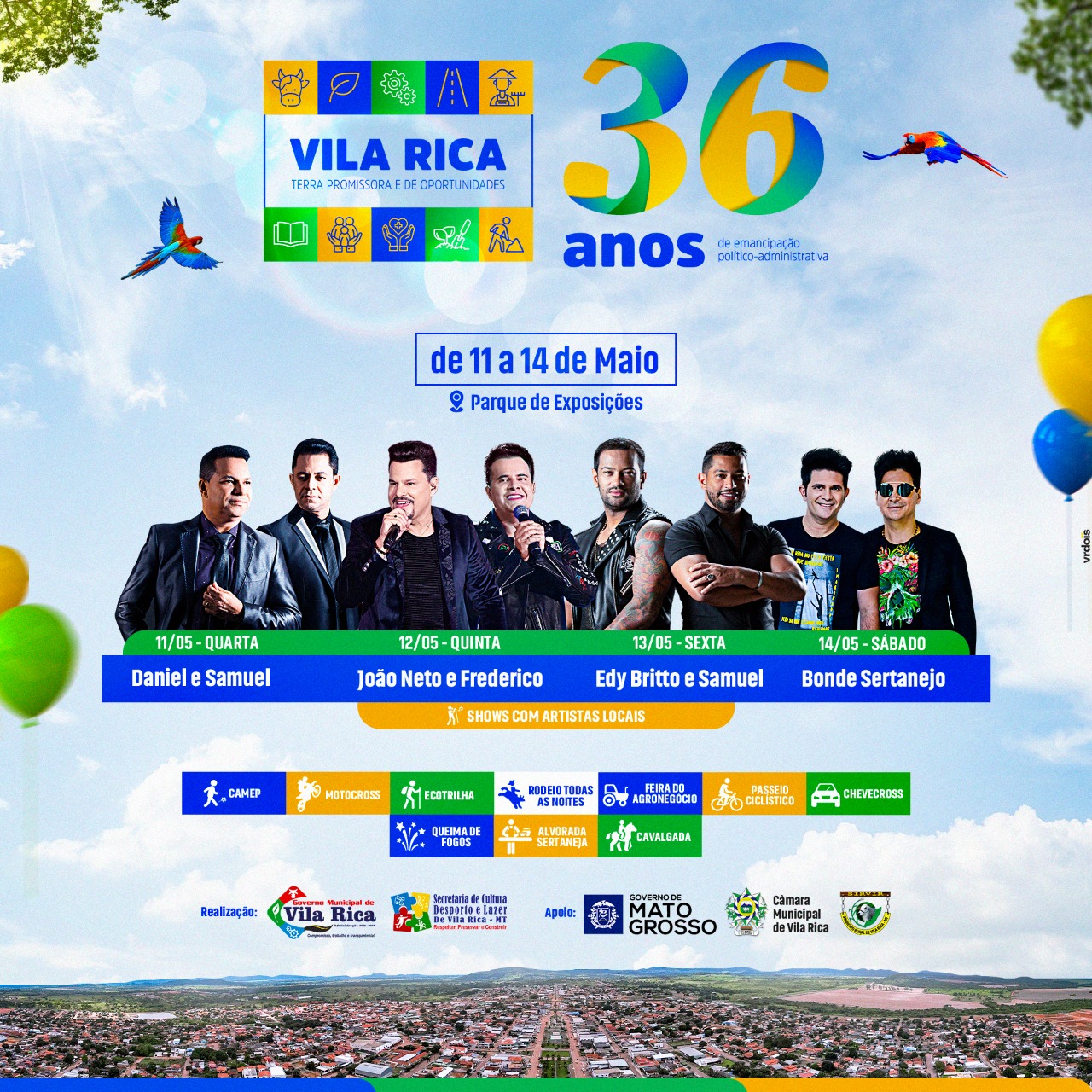 O Governo Municipal de Vila Rica através da Secretaria de Cultura Desporto e Lazer divulgou nesta sexta-feira, 18 de março a programação oficial alusivas ao aniversário de 36 anos de Emancipação Político-administrava do município, comemorado no dia 13 de maio, sobre o tema “Terra promissora e de oportunidades”. O evento acontecerá no parque de Exposição de Vila Rica.