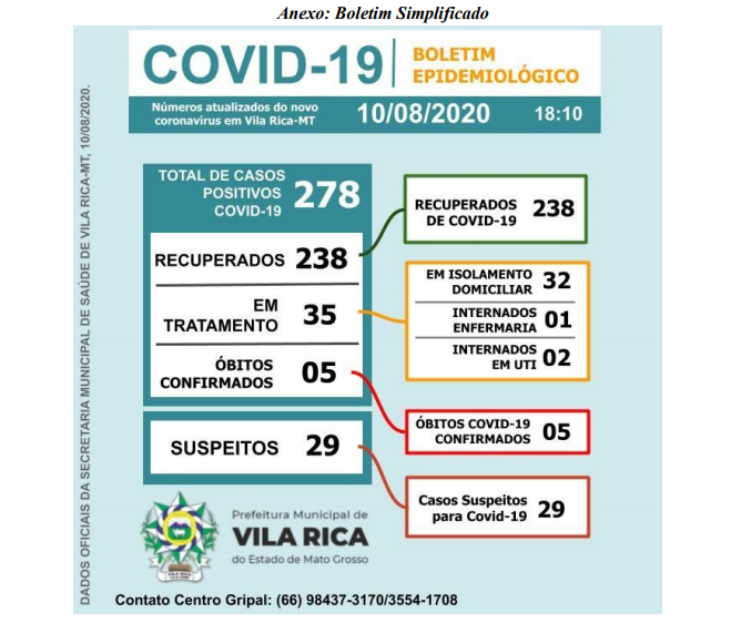 NOTA DE ESCLARECIMENTO PARA LEITURA E INTERPRETAÇÃO DO NOVO BOLETIM EPIDEMIOLÓGICO SIMPLIFICADO. Vila Rica-MT, 10 de agosto de 2020.