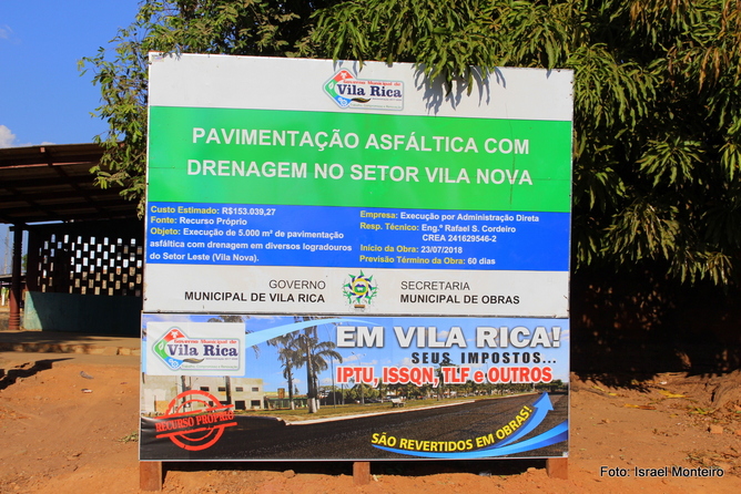 Em 2018, a Prefeitura de Vila Rica avançou com ações de infraestrutura em vários bairros da cidade. As melhorias é resultado de um planejamento do Governo Municipal, que visa aplicar os recursos de impostos como IPTU, ISSQN, TLF entre outros impostos pagos pelos contribuintes em ações que tragam melhor qualidade de vida para a população vilariquense.
